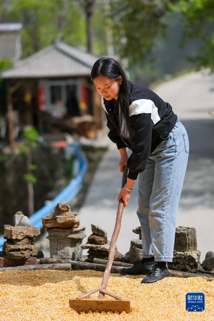 陳曉麗幫村民翻曬玉米(4月18日攝)。新華社記者 張鋮 攝