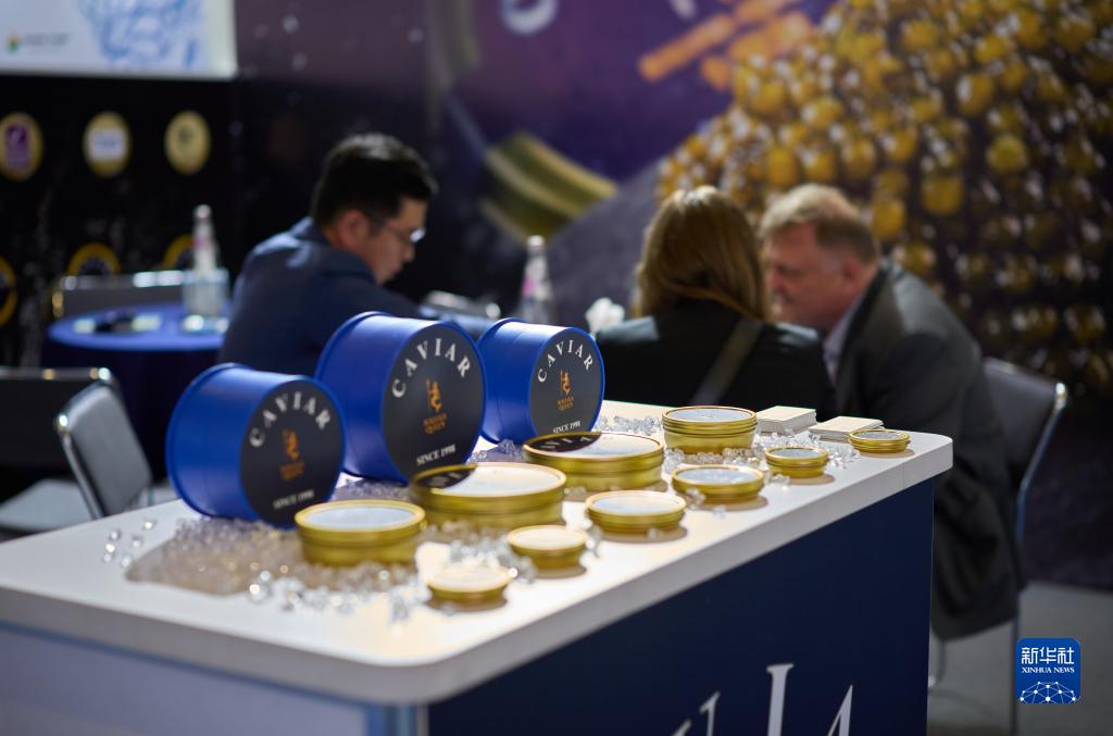 4月25日,在西班牙巴塞羅那舉行的全球水產(chǎn)品博覽會(huì )上,參展商和參觀(guān)者在一家浙江魚(yú)子醬企業(yè)展臺洽談。