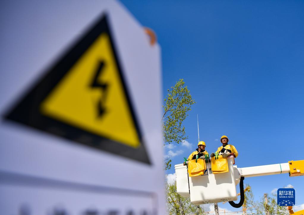 4月26日,扎西尼瑪(右)和徒弟在進(jìn)行高空帶電作業(yè)演練。