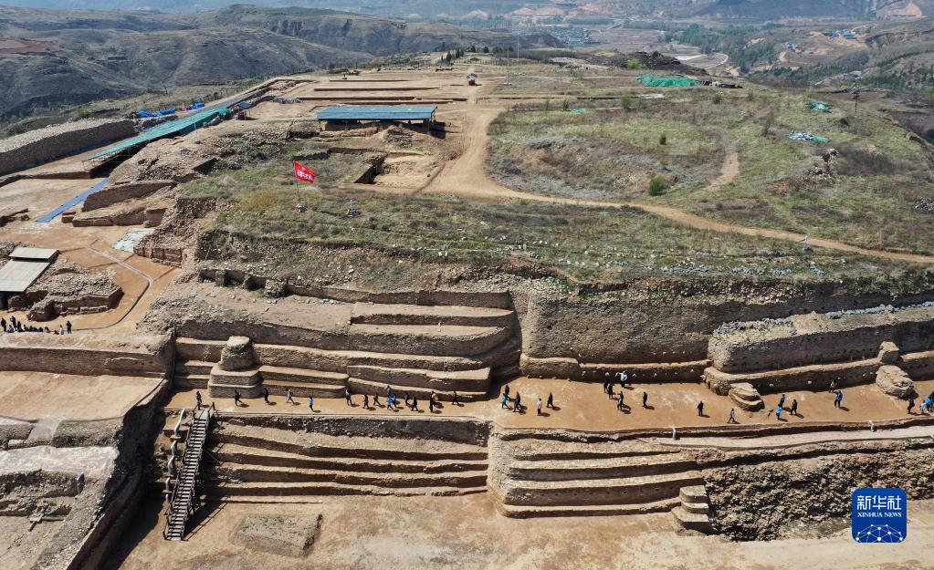 4月26日,外賓在陜西石峁遺址皇城臺遺址參觀(guān)調研(無(wú)人機照片)。