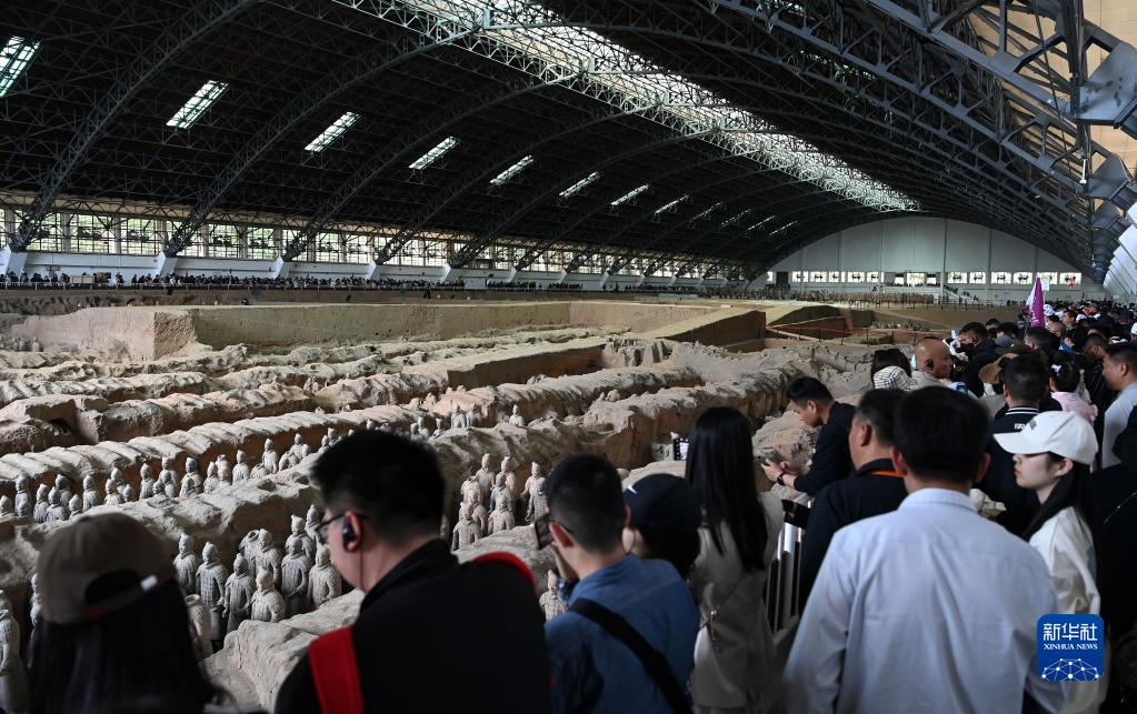 4月26日,游客在秦兵馬俑一號坑遺址內參觀(guān)。
