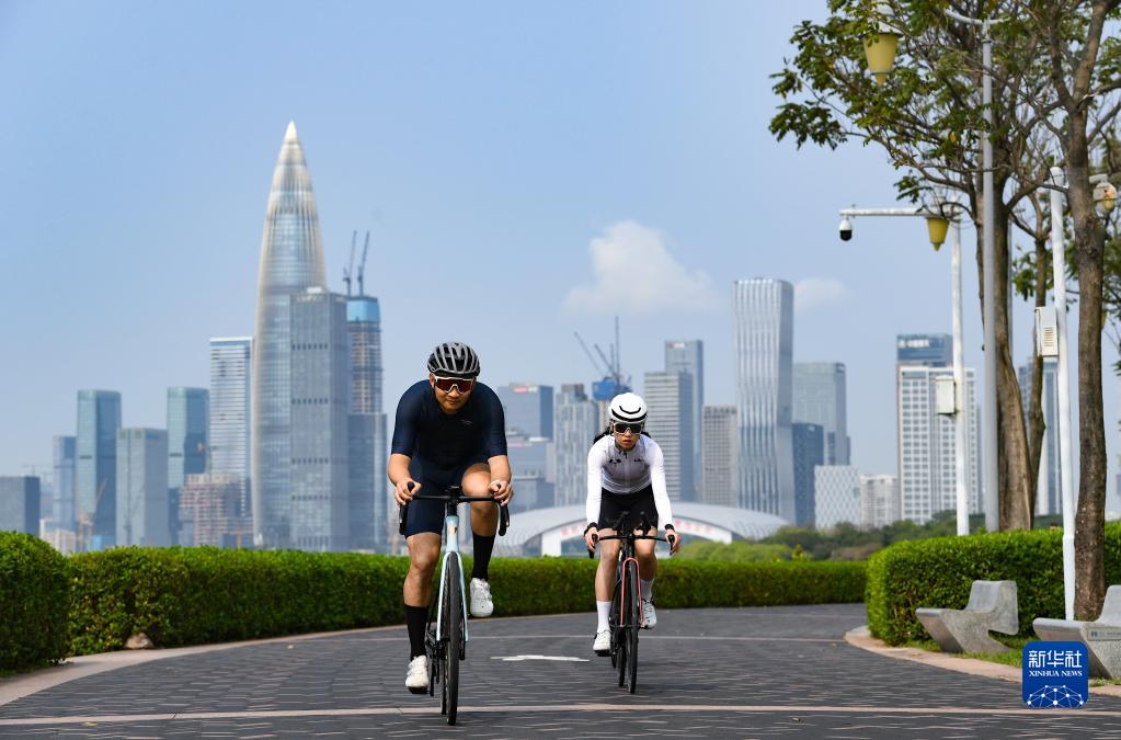 4月11日,騎行愛(ài)好者楊曉輝(左)、張倩在深圳灣海濱休閑帶綠道騎行。這個(gè)綠道傍海而建,風(fēng)光旖旎,是深圳騎行愛(ài)好者的熱門(mén)打卡地之一。