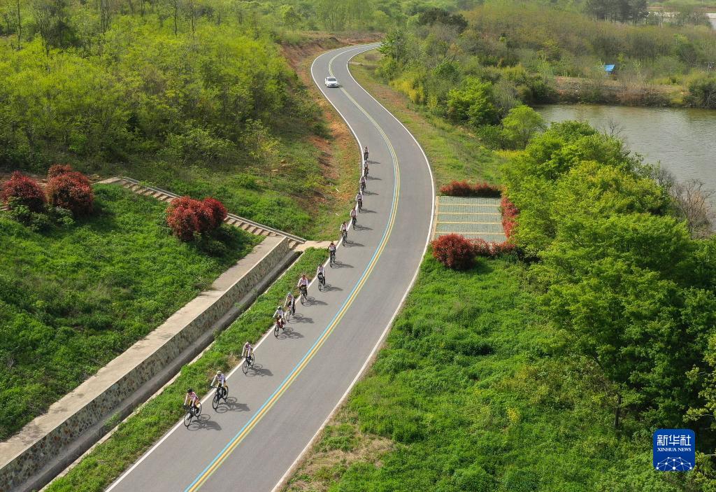 4月12日,騎行愛(ài)好者在江蘇省句容市天王鎮騎行(無(wú)人機照片)。
