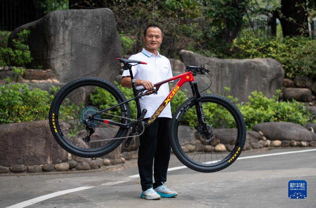 4月13日,在深圳市喜德盛自行車(chē)股份有限公司,工作人員單手輕松拎起由超輕碳纖維材料打造的自行車(chē)。該車(chē)型曾經(jīng)作為中國國家山地自行車(chē)隊東京奧運戰車(chē),整車(chē)重量?jì)H9.6千克。