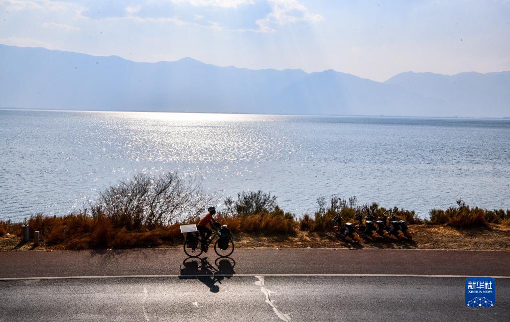 4月19日,來(lái)自廣東的騎行愛(ài)好者潘有輝騎行在云南大理洱海邊。數月前他從廣東佛山出發(fā),一路騎行抵達大理。