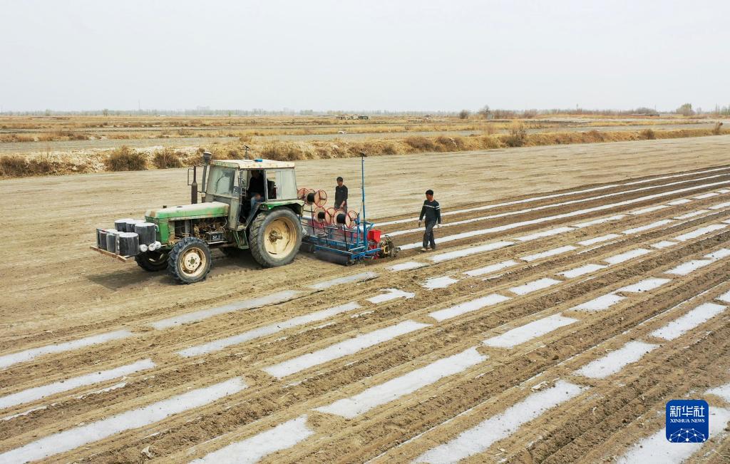 新疆尉犁縣巴西買(mǎi)里村,爾肯·熱衣木駕駛拖拉機春播(4月17日攝,無(wú)人機照片)。