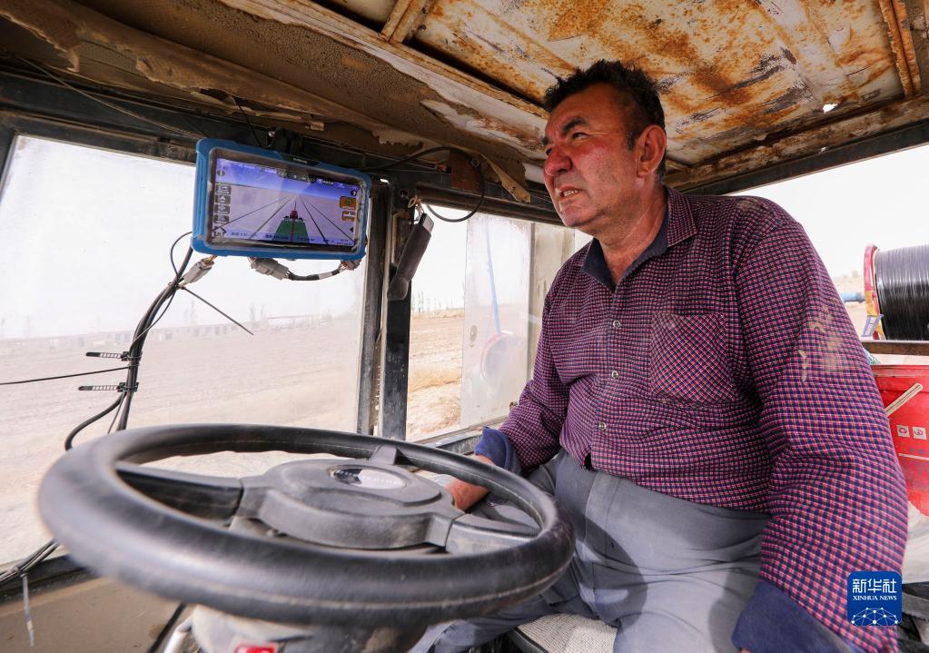 新疆尉犁縣巴西買(mǎi)里村,爾肯·熱衣木在裝有北斗導航系統的拖拉機上(4月17日攝)。