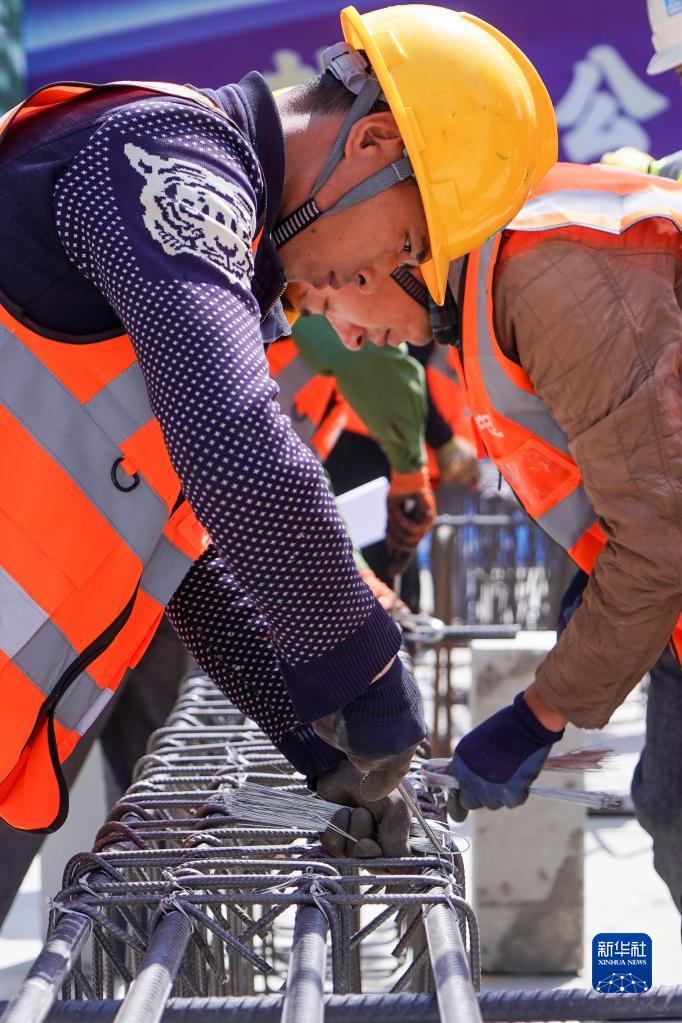 4月27日,在江蘇南京華貿項目施工現場(chǎng),建設者代表在中建三局浙江公司組織的“技能大比武”活動(dòng)中參加鋼筋綁扎比賽。