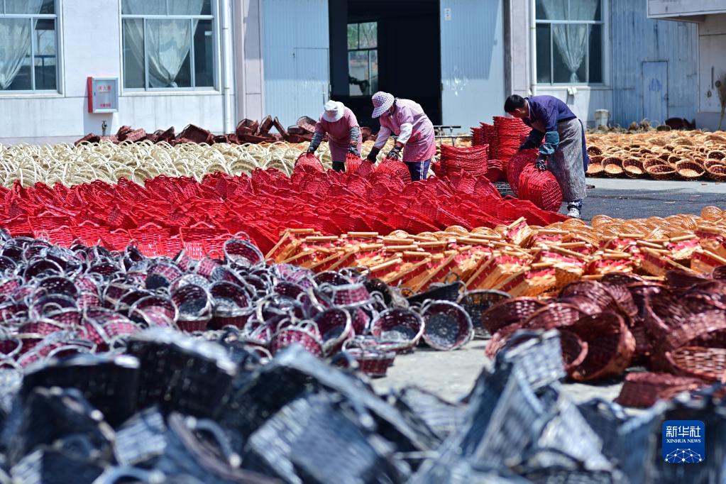4月26日,在臨沭縣騰奧工藝品有限公司院內,工作人員在晾曬柳編產(chǎn)品。