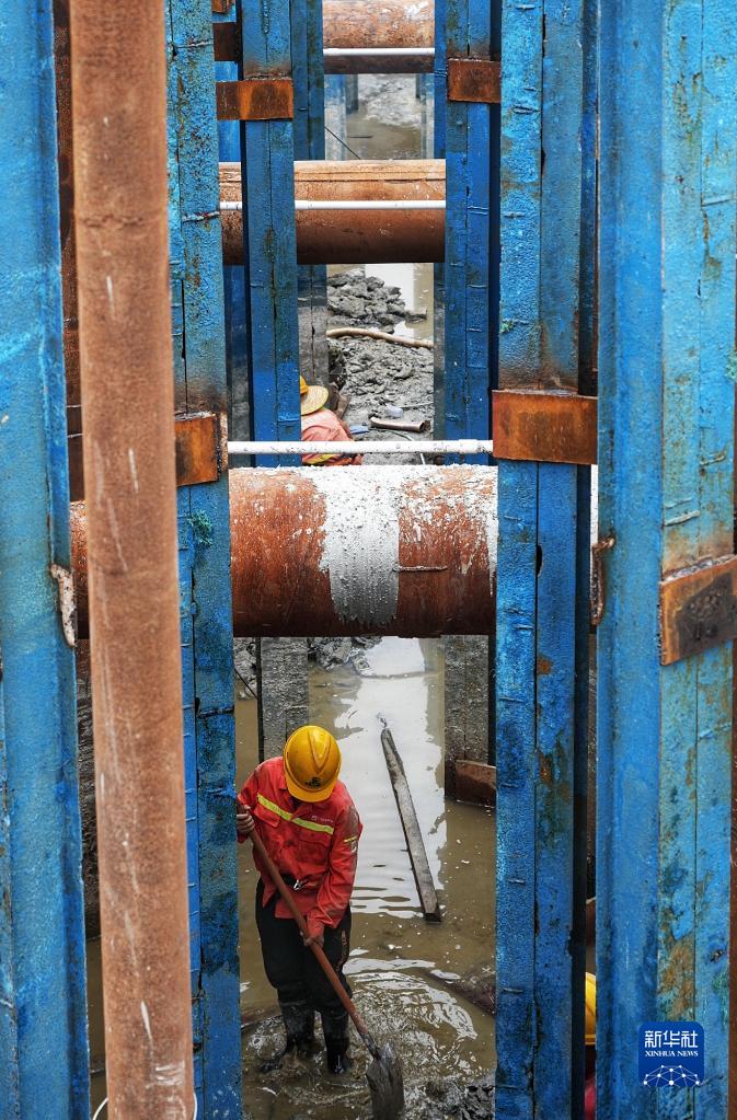 4月27日,施工人員在潭江特大橋樁基承臺進(jìn)行封底施工。