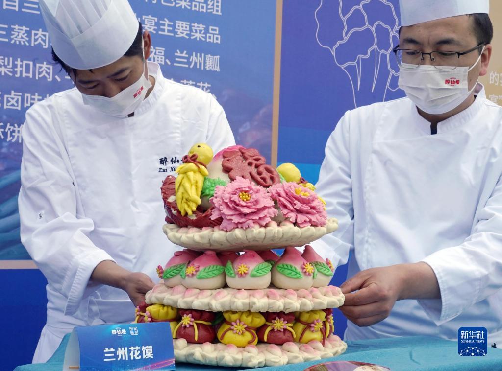4月27日,來(lái)自蘭州的面點(diǎn)師展示他們制作的蘭州花饃。