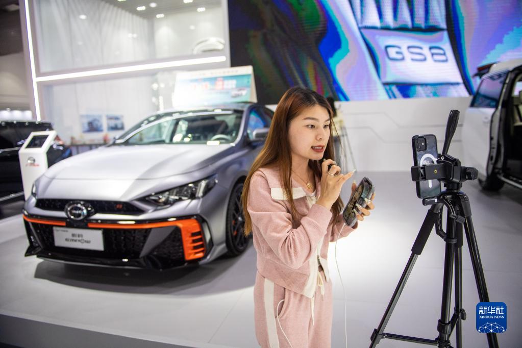 4月28日,一名主播通過(guò)直播介紹參展汽車(chē)。