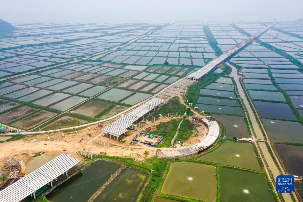 4月28日拍攝的黃茅??绾Mǖ澜T(mén)臺山段赤溪東互通架梁現場(chǎng)(無(wú)人機照片)。
