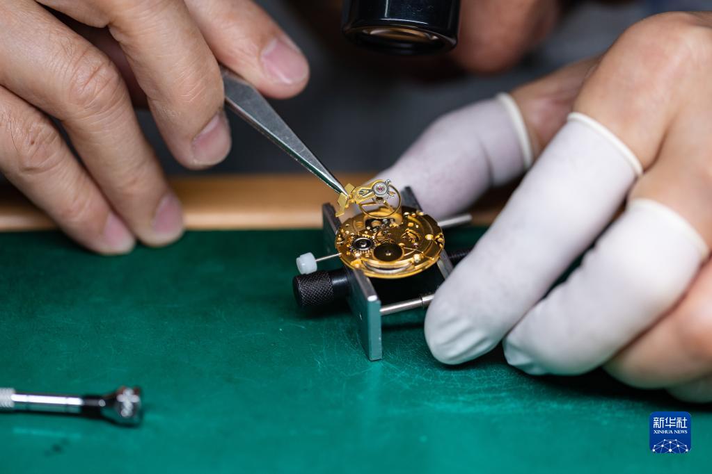 4月25日,在位于深圳的飛亞達鐘表大廈,劉中華為一塊手表安裝擺輪部件。新華社記者 毛思倩 攝