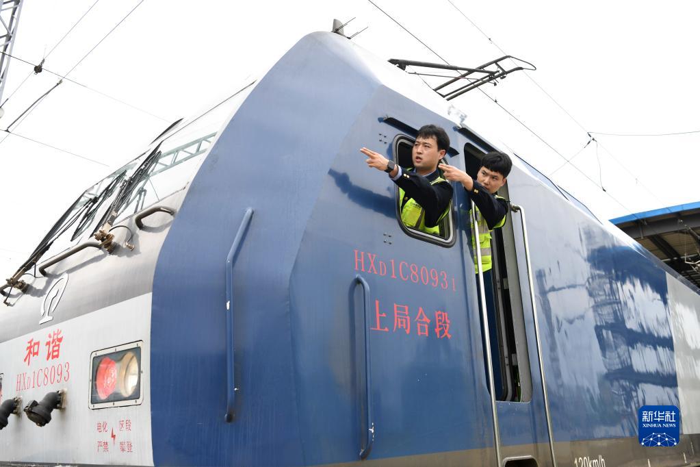 4月28日,尚志雄(左)和副司機田錦波在值乘的中歐班列機車(chē)上做出發(fā)前的準備。新華社記者 劉軍喜 攝