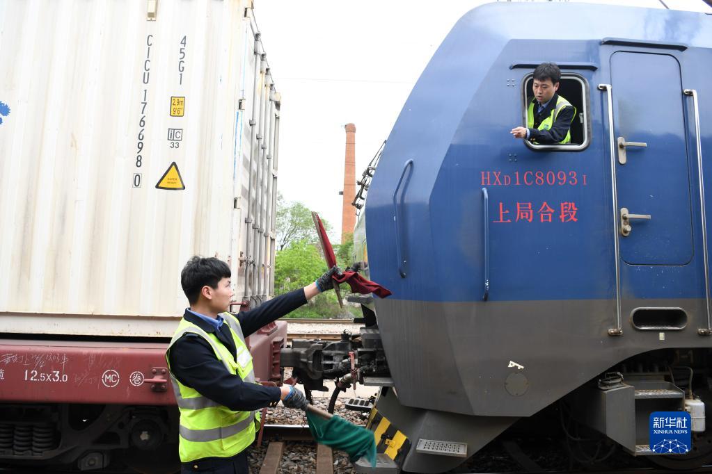 4月28日,副司機田錦波(左)在合肥東站指揮機車(chē)與中歐班列列車(chē)對接。新華社記者 劉軍喜 攝