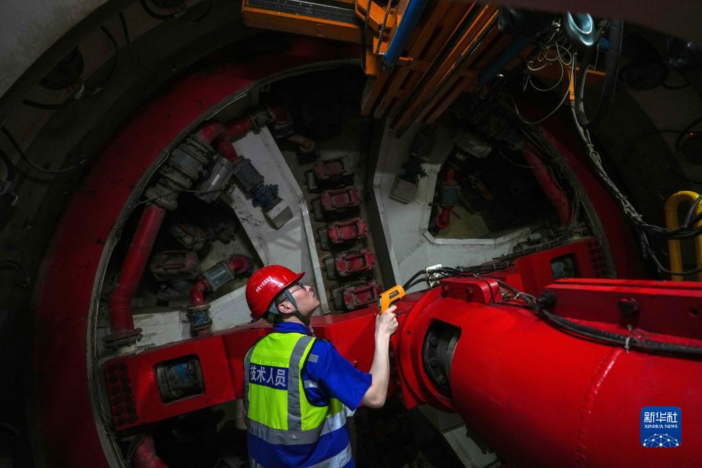 在盾構機推進(jìn)一環(huán)結束后的管片拼裝期間,黃魯檢查盾構機設備(4月19日攝)。