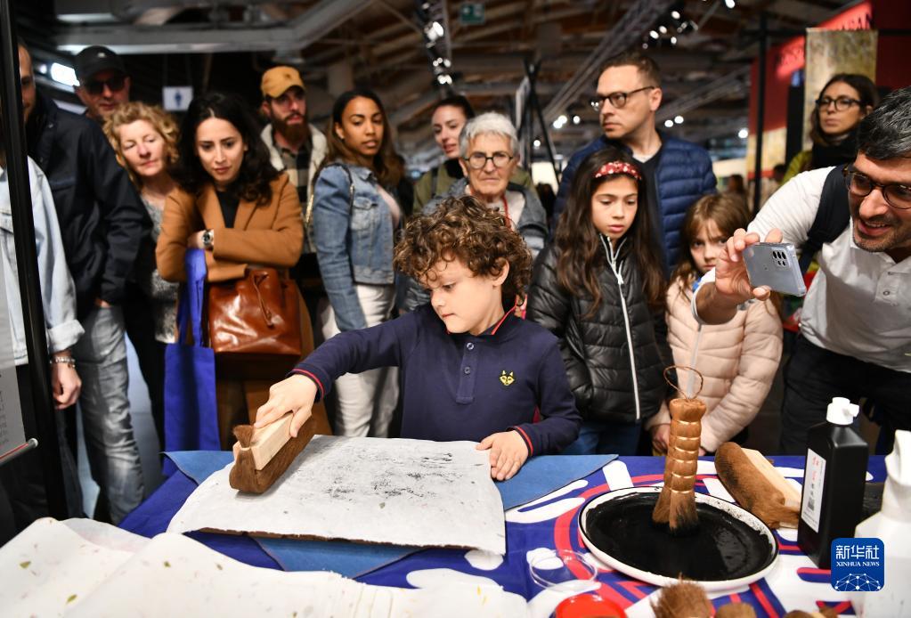 4月25日,在意大利佛羅倫薩舉辦的國際手工藝展覽會(huì )上,一名兒童體驗中國木版年畫(huà)拓印互動(dòng)項目。
