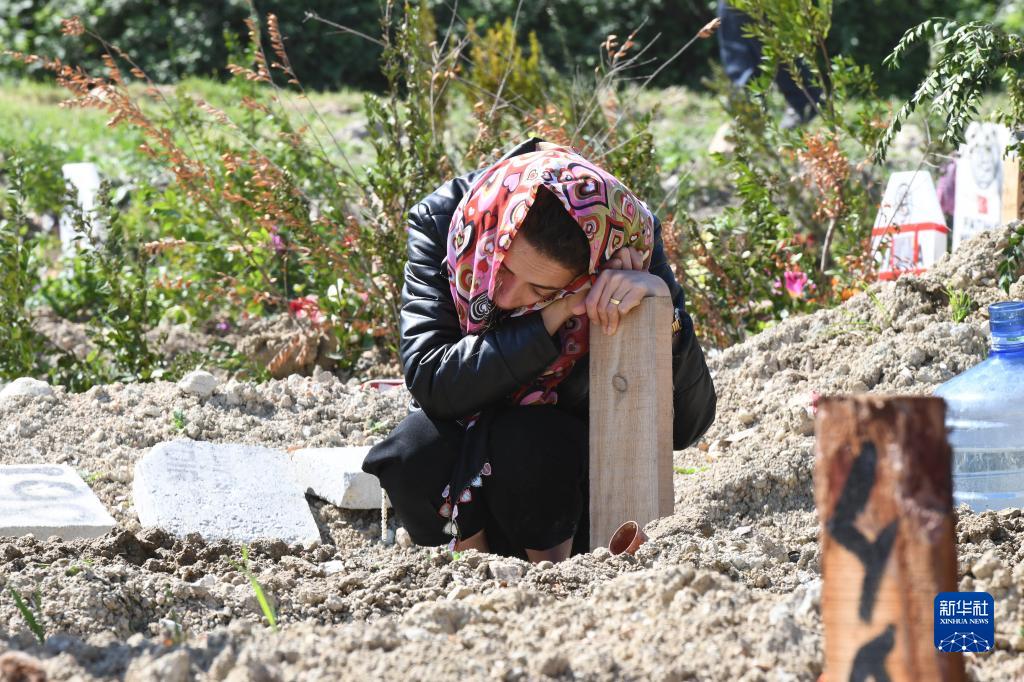 4月23日,一名女子在土耳其哈塔伊一處墓地悼念在地震中遇難的親人。