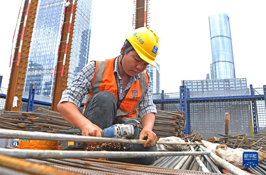 4月29日,工人在廣西南寧市良慶區中建三局一公司南寧中銀金融中心項目建設工地切割鋼管。