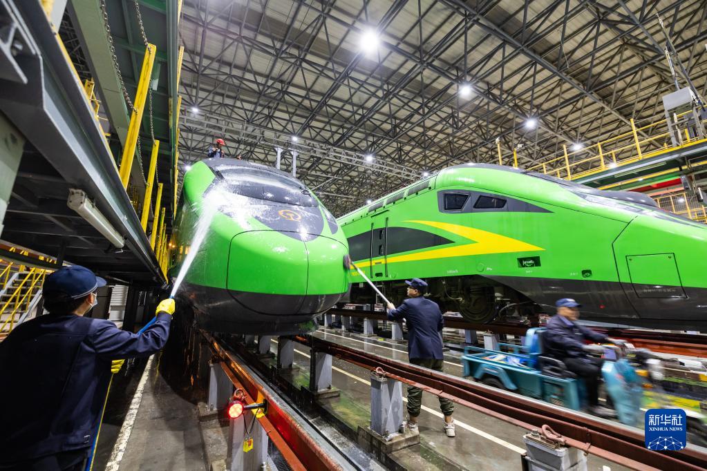 4月29日凌晨,在西安東客車(chē)整備所,工作人員在清潔列車(chē)。