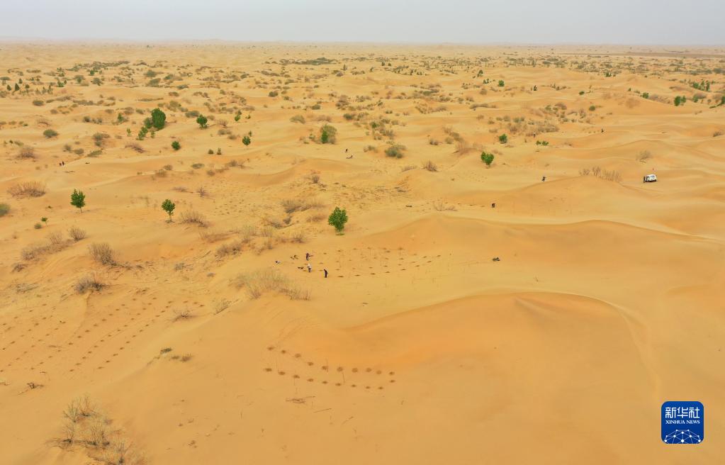 治沙客在內蒙古庫布其沙漠億利生態(tài)治理區種植苗木(4月27日攝,無(wú)人機照片)。
