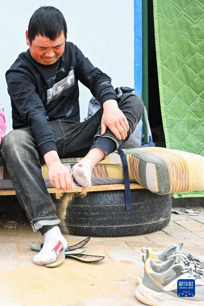 干完活回到臨時(shí)板房后,治沙客周斌祿清理鞋中的沙子(4月27日攝)。