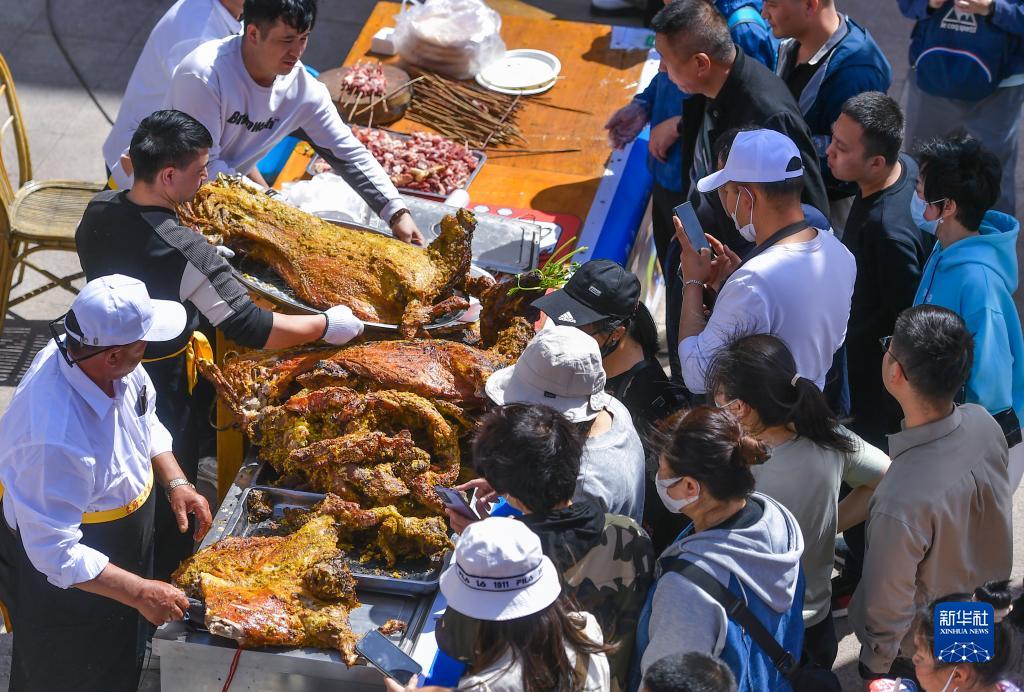 4月29日,在新疆烏魯木齊國際大巴扎舉行的燒烤節上,工作人員為游客端出剛出爐的烤全羊。
