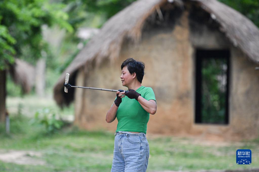 4月28日,游客在海南省東方市白查村參觀(guān)、拍攝黎族船型屋。