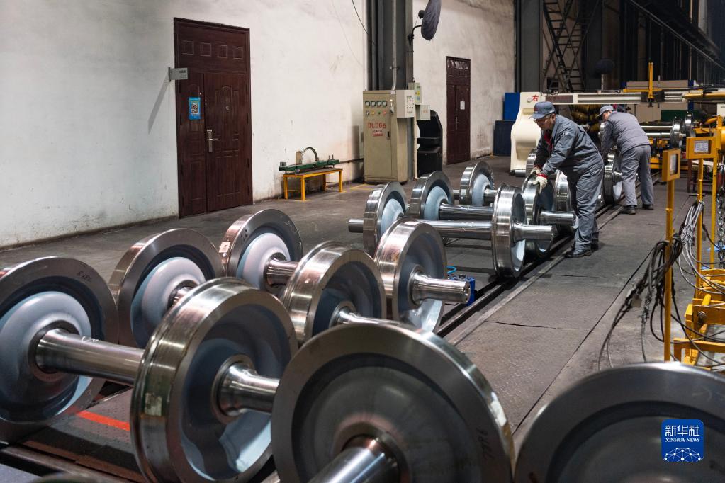 在位于黑龍江省齊齊哈爾市的中車(chē)齊車(chē)公司生產(chǎn)車(chē)間,工人進(jìn)行生產(chǎn)作業(yè)(4月19日攝)。