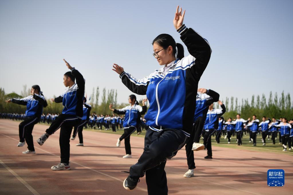 敦煌中學(xué)的學(xué)生在操場(chǎng)上做敦煌舞課間操(4月26日攝)。
