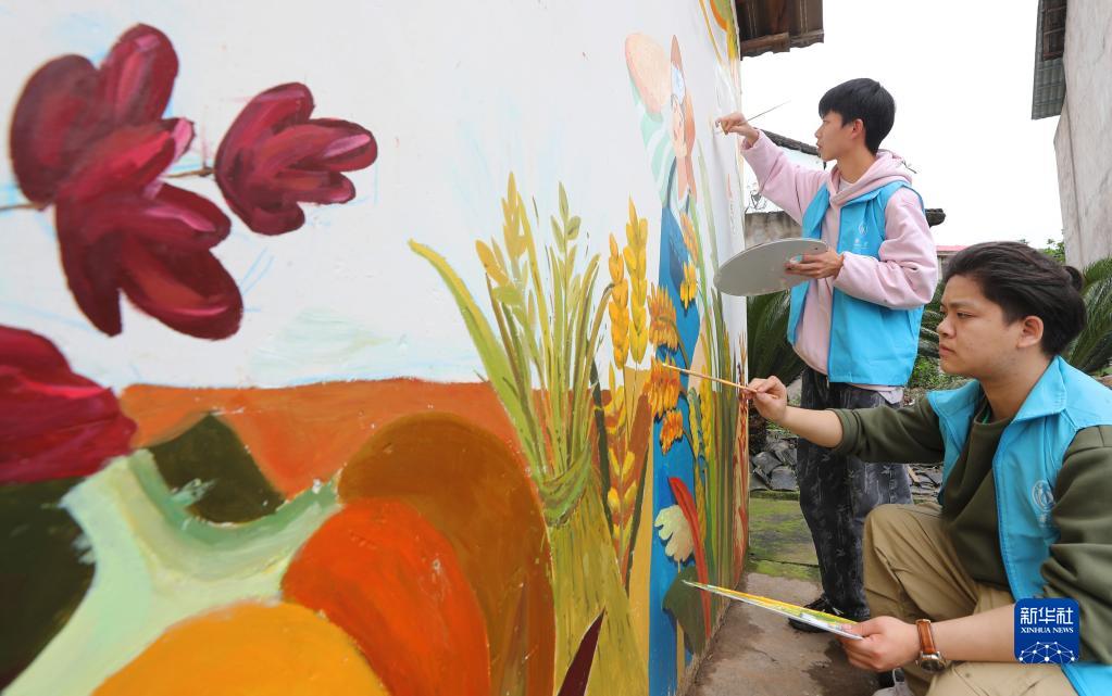 4月29日,在衡陽(yáng)縣西渡鎮新橋村,南華大學(xué)的大學(xué)生志愿者在繪墻畫(huà)。