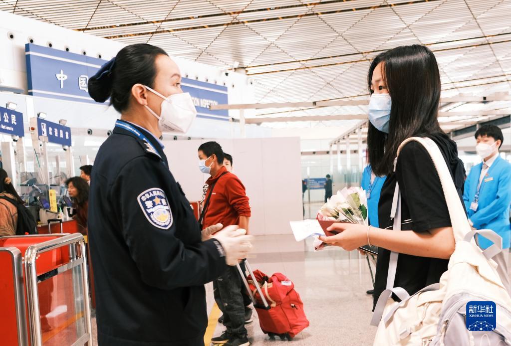 4月29日,在北京首都國際機場(chǎng),北京邊檢總站民警與入境公民交流。