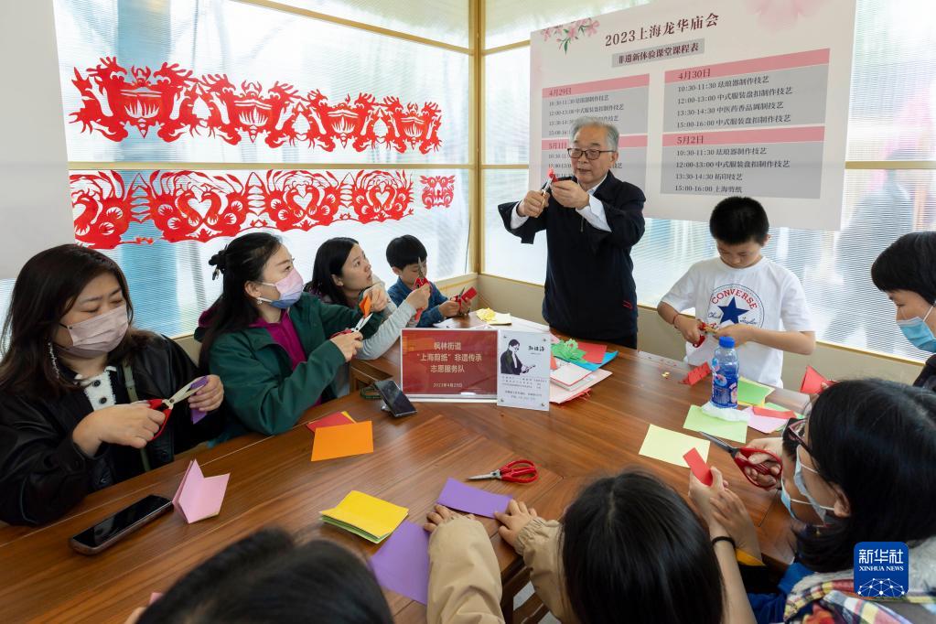 4月29日,人們在龍華廟會(huì )上體驗剪紙課程。