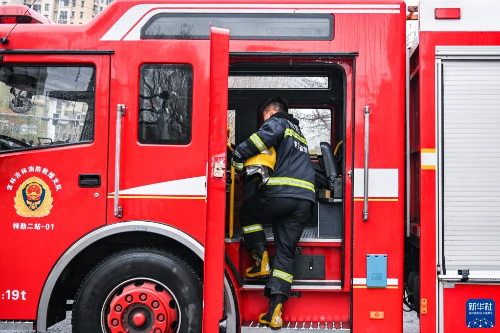 吉林省吉林消防救援支隊特勤大隊二站消防員孟祥一登上消防車(chē)(2023年4月28日攝)。