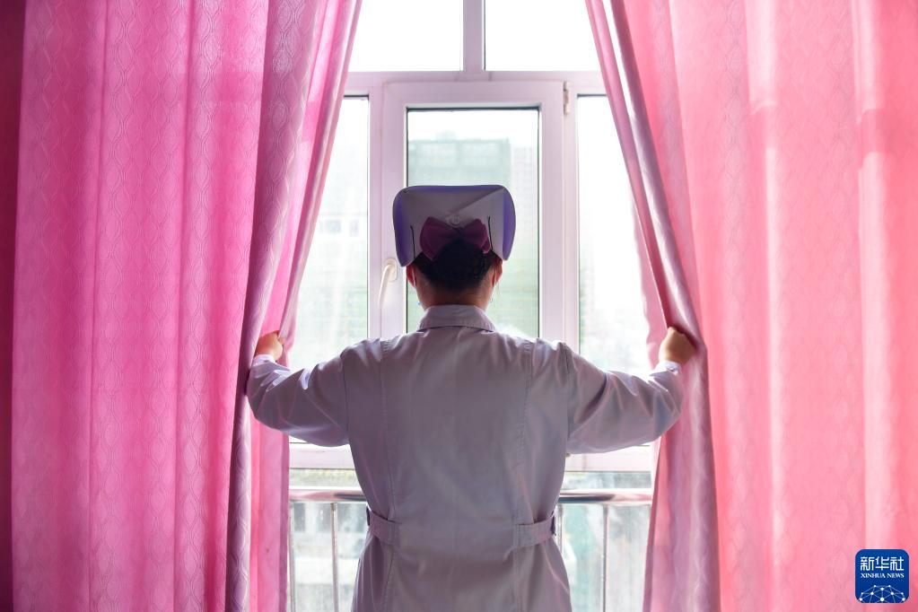 青海省海東市第一人民醫院內科護士劉海婷在病房?jì)葹榛颊呃_(kāi)窗簾(2020年12月16日攝)。
