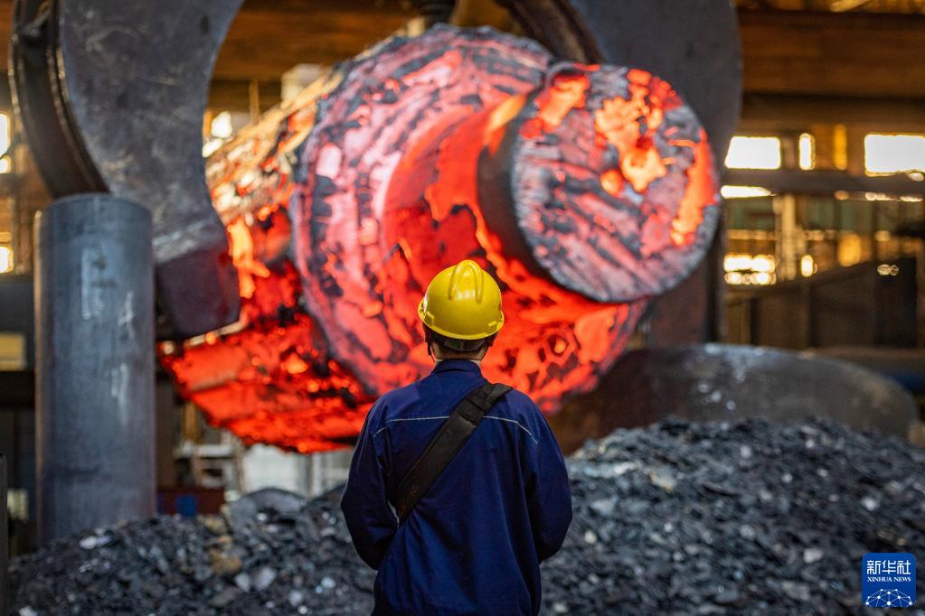 在位于黑龍江省齊齊哈爾市的中國一重生產(chǎn)車(chē)間,工人操控吊鉗吊運加熱后的鍛件(2023年4月18日攝)。