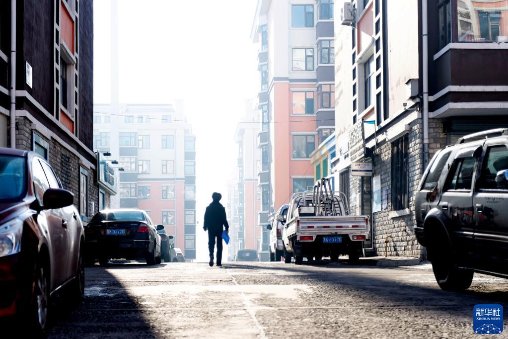 在黑龍江省七臺河市桃山區,社區民警劉欣在管轄社區內巡邏(2022年1月9日攝)。