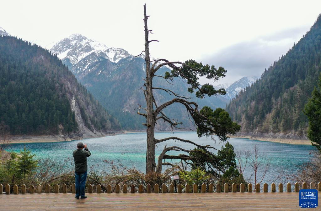 在四川省阿壩藏族羌族自治州九寨溝景區,九寨溝風(fēng)景名勝區管理局環(huán)保高級工程師肖維陽(yáng)在觀(guān)察長(cháng)海的生態(tài)環(huán)境(2023年4月27日攝,無(wú)人機照片)。