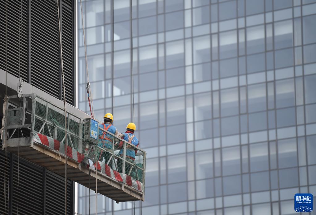 在位于陜西省西咸新區的西部云谷三期建設項目施工現場(chǎng),中建三局西北公司工人在工作(2023年2月17日攝)。