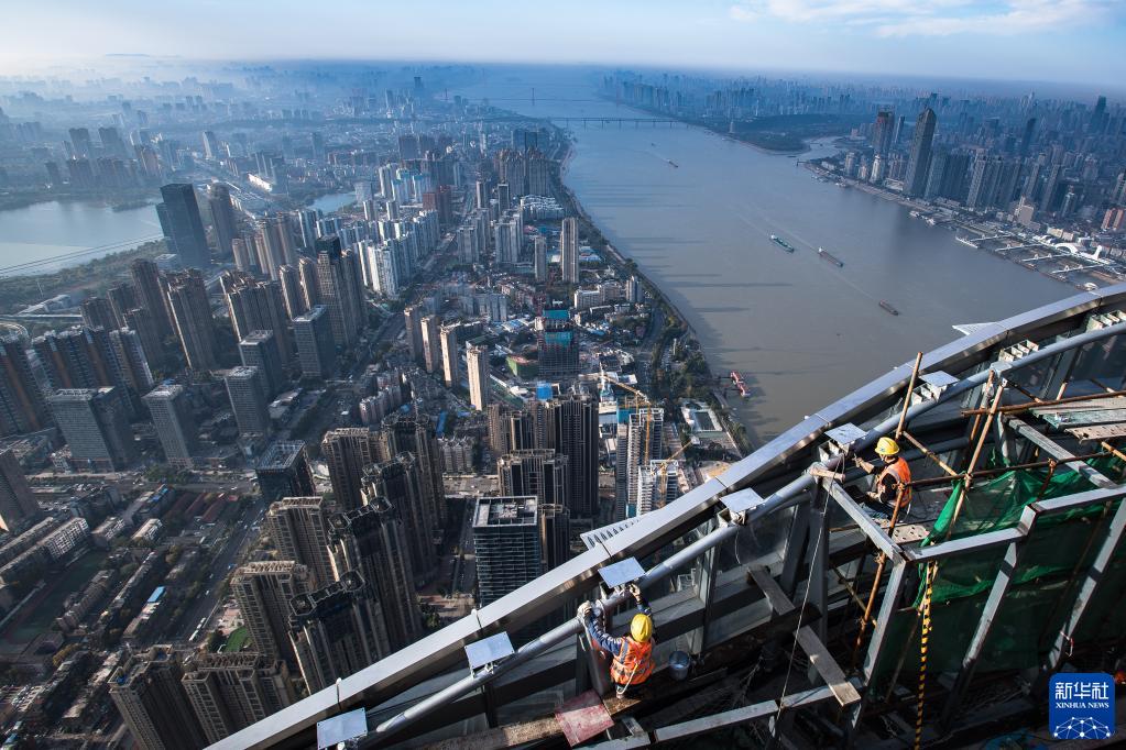 在湖北省武漢市一處建筑工地,工人在進(jìn)行高空作業(yè)(2021年11月15日攝)。