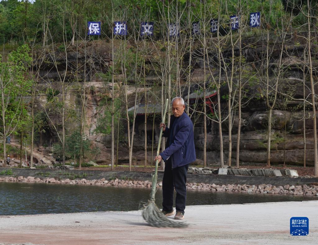 4月3日,吳忠富在臥佛院內打掃衛生。