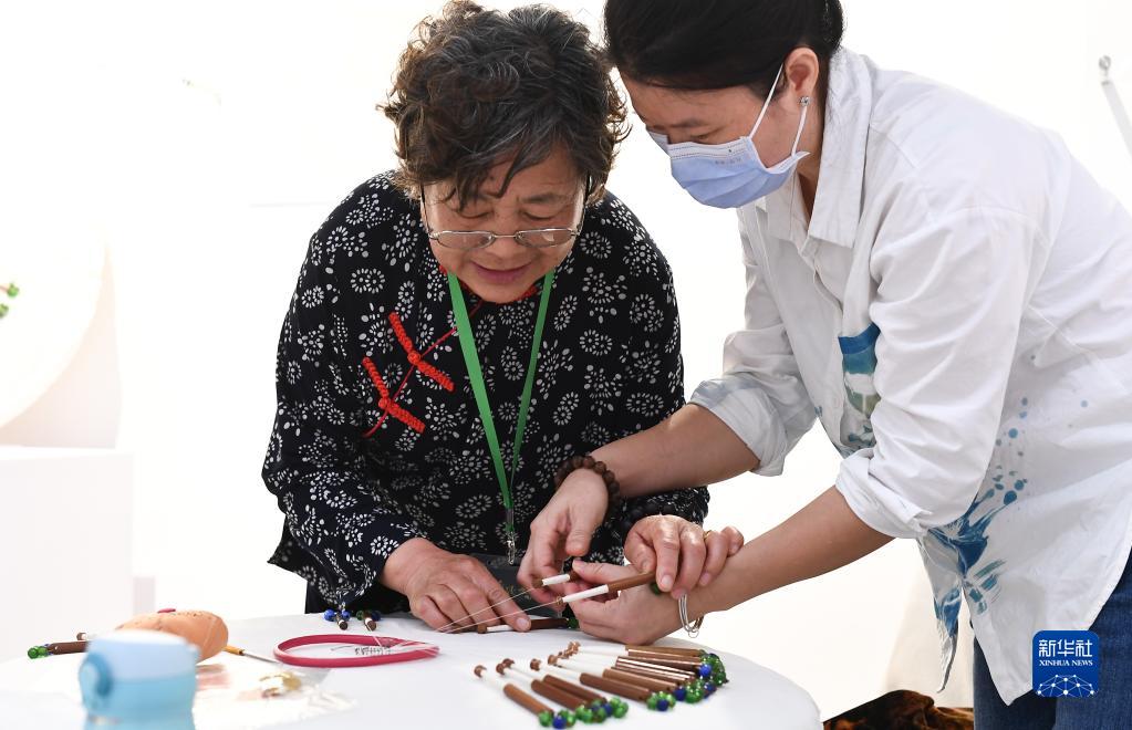 4月30日,在2023海南錦繡世界文化周非物質(zhì)文化遺產(chǎn)傳統織繡印染技藝項目精品展上,觀(guān)眾在向傳承人學(xué)習編織青州府花邊大套。