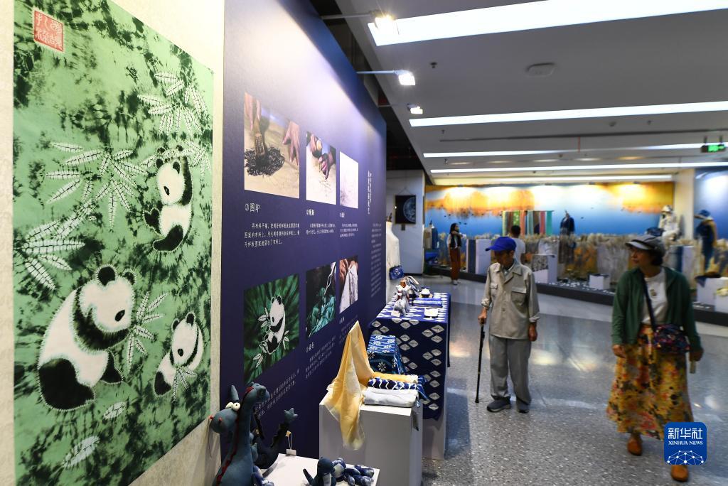 4月30日,觀(guān)眾在參觀(guān)2023海南錦繡世界文化周非物質(zhì)文化遺產(chǎn)傳統織繡印染技藝項目精品展展出的自貢扎染技藝。