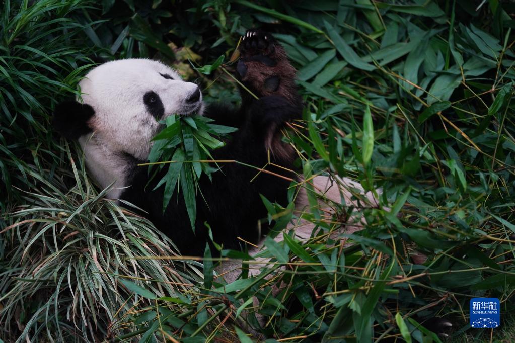 在香港海洋公園,大熊貓“樂(lè )樂(lè )”在吃早餐(4月19日攝)。