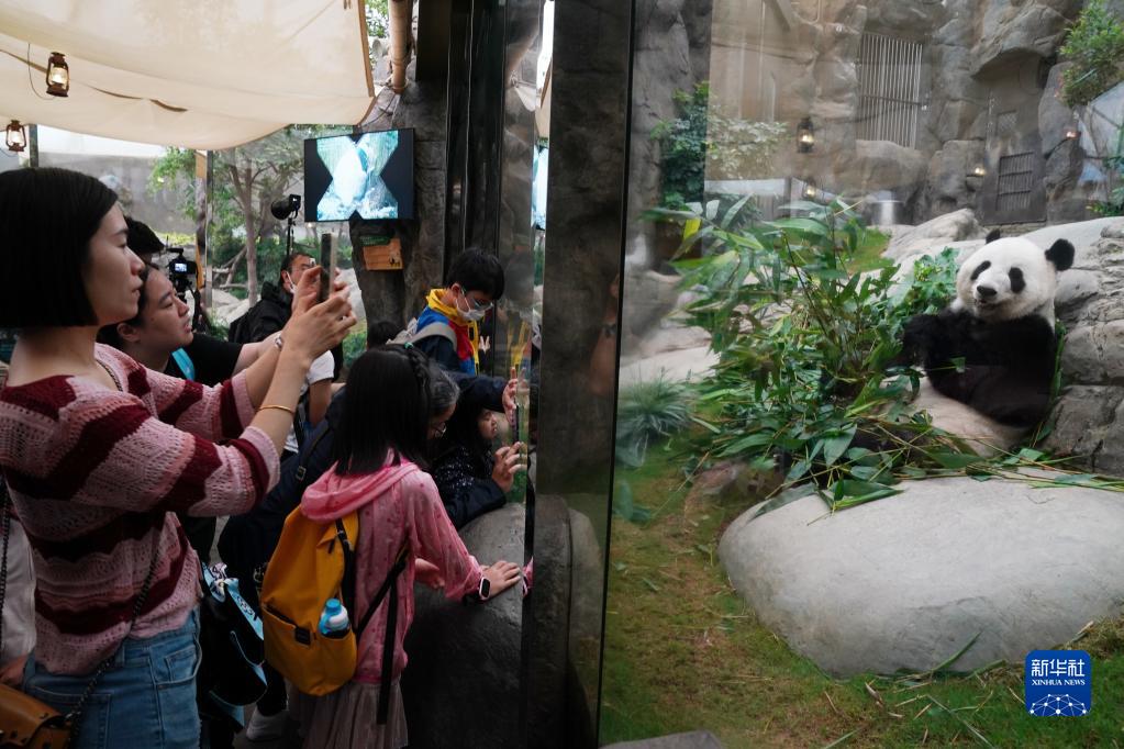 在香港海洋公園,游客用手機拍攝大熊貓“盈盈”(4月19日攝)。
