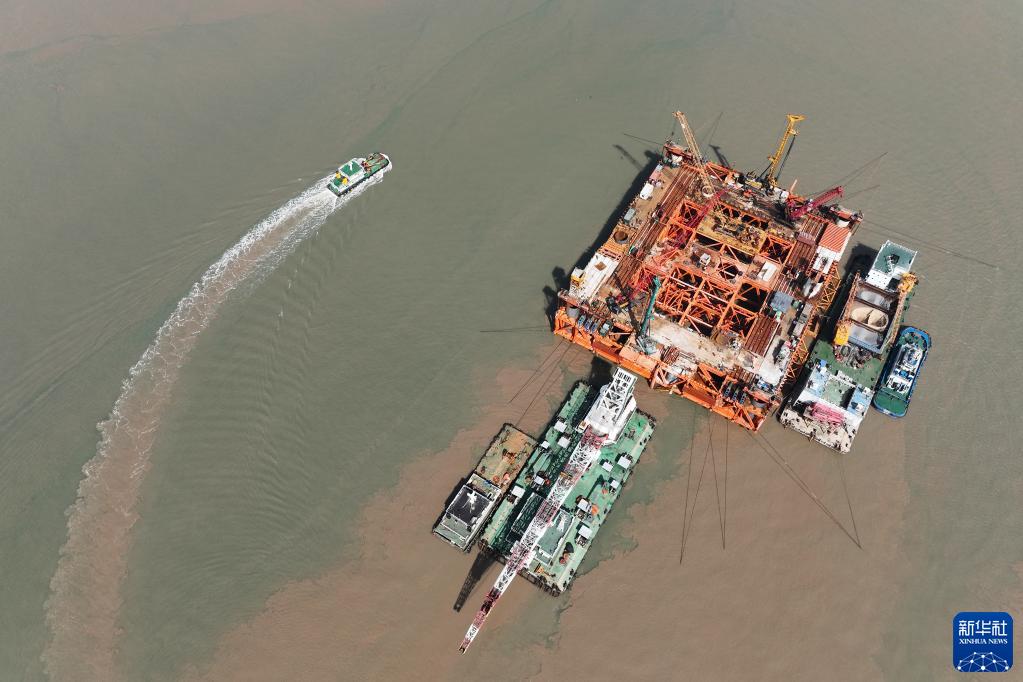 4月30日,在位于浙江省舟山市定海區冊子島海邊的甬舟鐵路西堠門(mén)公鐵兩用橋5、6號墩建設工地,中鐵大橋局的工人進(jìn)行施工(無(wú)人機照片)。