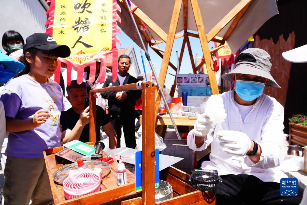 4月30日,在山東省利津縣“老街長(cháng)巷”非遺文化街,游客觀(guān)看吹糖人制作。