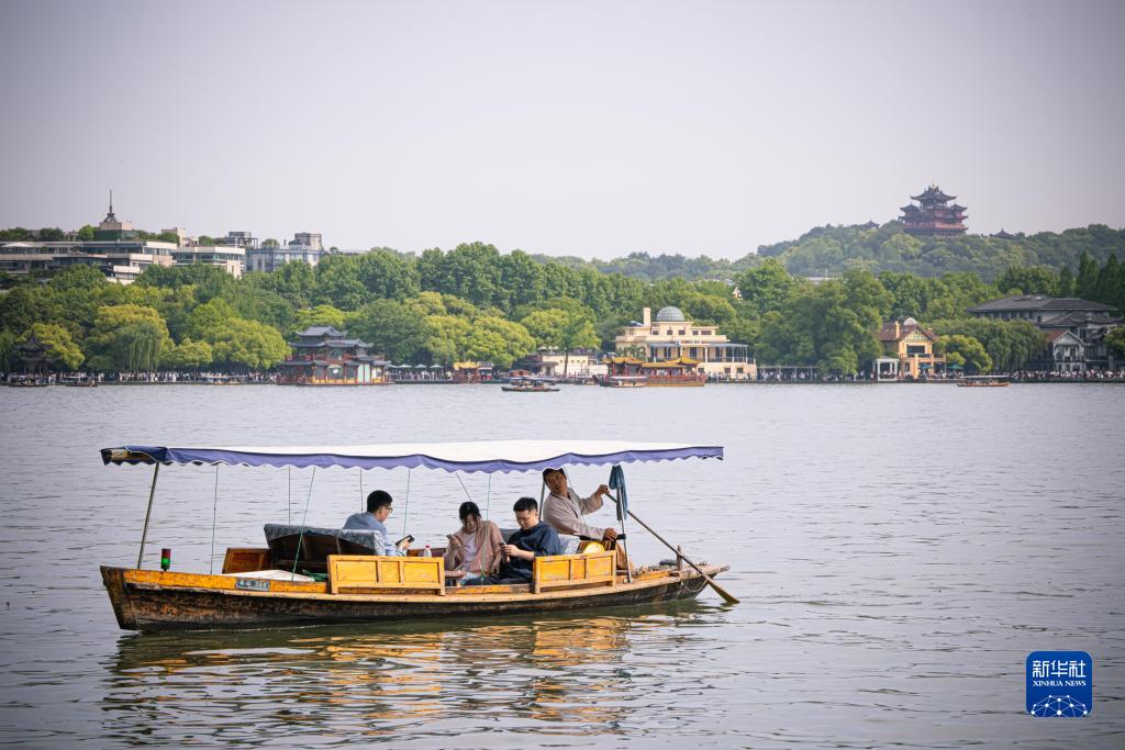 4月30日,游客乘坐手劃船游覽杭州西湖。