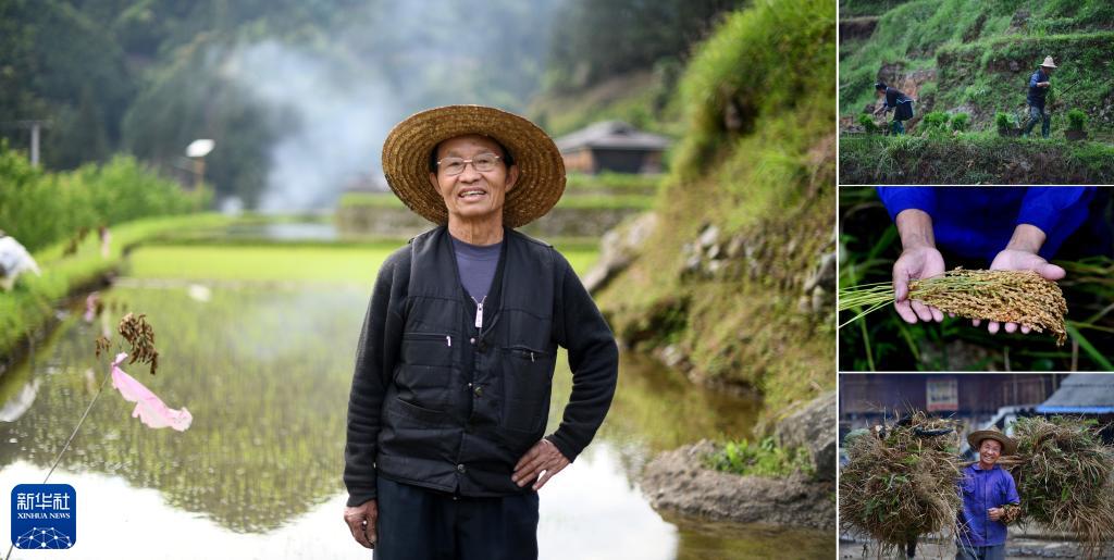 拼版照片:左圖為廣西融水苗族自治縣桿洞鄉烏英苗寨73歲的老人梁安合(2023年4月25日攝);右上圖為梁安合(右)和老伴在田間插秧(2020年5月21日攝);右中圖為梁安合展示收獲的稻谷(2020年9月10日攝);右下圖為梁安合勞作歸來(lái)(2019年3月25日攝)。